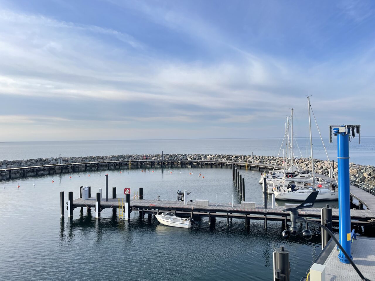 Ideales Wetter zum Weiterkommen. Heute wollten wir weiter gen Osten Richtung Hiddensee. Wind und Welle waren kommod und gaben uns die Route an der deutschen Küste entlang vor. Nach 9,5 Stunden, der Wind frischte auf, beschlossen wir im nagelneuen Inselhafen Prerow Station zu machen. Er liegt draußen am Ende der ebenfalls nagelneuen mit 720m längsten Seebrücke der Ostsee. Bis auf 4 Segler alles leer. Eigentlich ist der Hafen Stützpunkt der Seenotrettung und als Nothafen gedacht. Deshalb auch sehr atmosphärearm, aber funktional. Noch ein walk die Brücke entlang zum Beinevertreten und dann Spargelpasta an Bord.