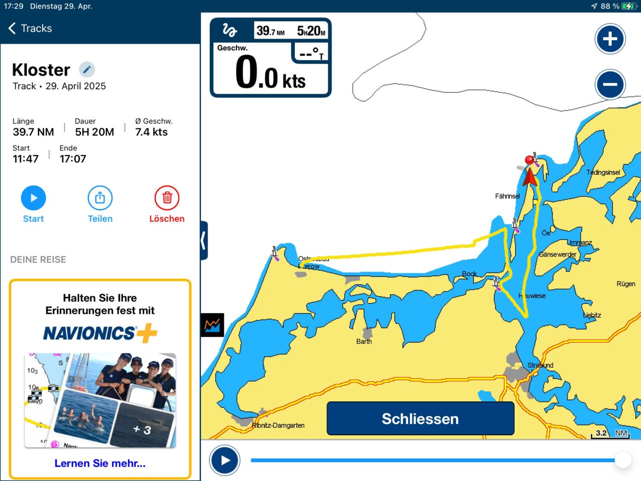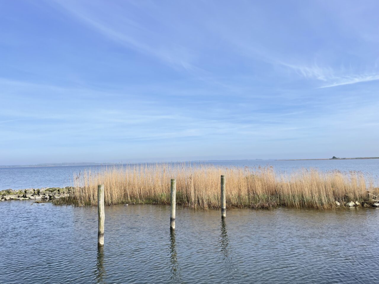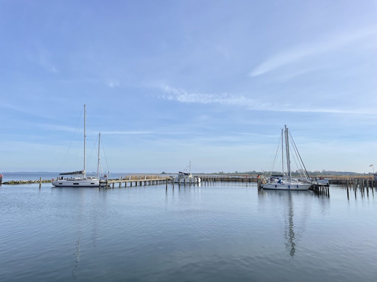 Die Nacht war recht stürmisch, aber wir lagen sehr geschützt. Früher Aufbruch war kontraproduktiv, sollte der Wind (und somit die Welle) doch gegen später moderater werden. Wir nutzten die Zeit noch eine kleine Radltour durchs Städtchen zu machen, schwelgten in Erinnerungen an 2019 als wir mit der Argo im Binnenhafen lagen und erledigten ein paar Einkäufe. Zurück am Schiff frühstücken und Leinen los. Die See zeigte sich sehr ruppig. Andreas löste den Autopiloten von Zeit zu Zeit ab und steuerte die Wellen aus so gut es ging. Trotzdem war der Kurs oben über die Spitze am Dornbusch nach Kloster rein zu ungemütlich, sodass der Käpten entschied unten bei Bock in die Abdeckung zu fahren, was eine 1,5 Stunden längere Fahrt bedeutete, dafür aber gemütlich. Nach den unruhigen 3 Stunden war es eine Wohltat im ruhigeren Wasser entlang der Insel zu schippern. In Kloster waren erwartungsgemäß Liegeplätze en masse frei … was für ein Unterschied zur Hauptsaison. In der ‚schönsten‘ Box mit der besten Aussicht nach 5,5 Stunden Fahrt festgemacht …. Ein gutes Gefühl wieder hier zu sein!