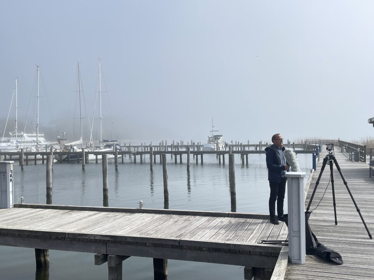 Wetterfrosch Kreibohm im Hafen bei der Aufnahme für den Abend