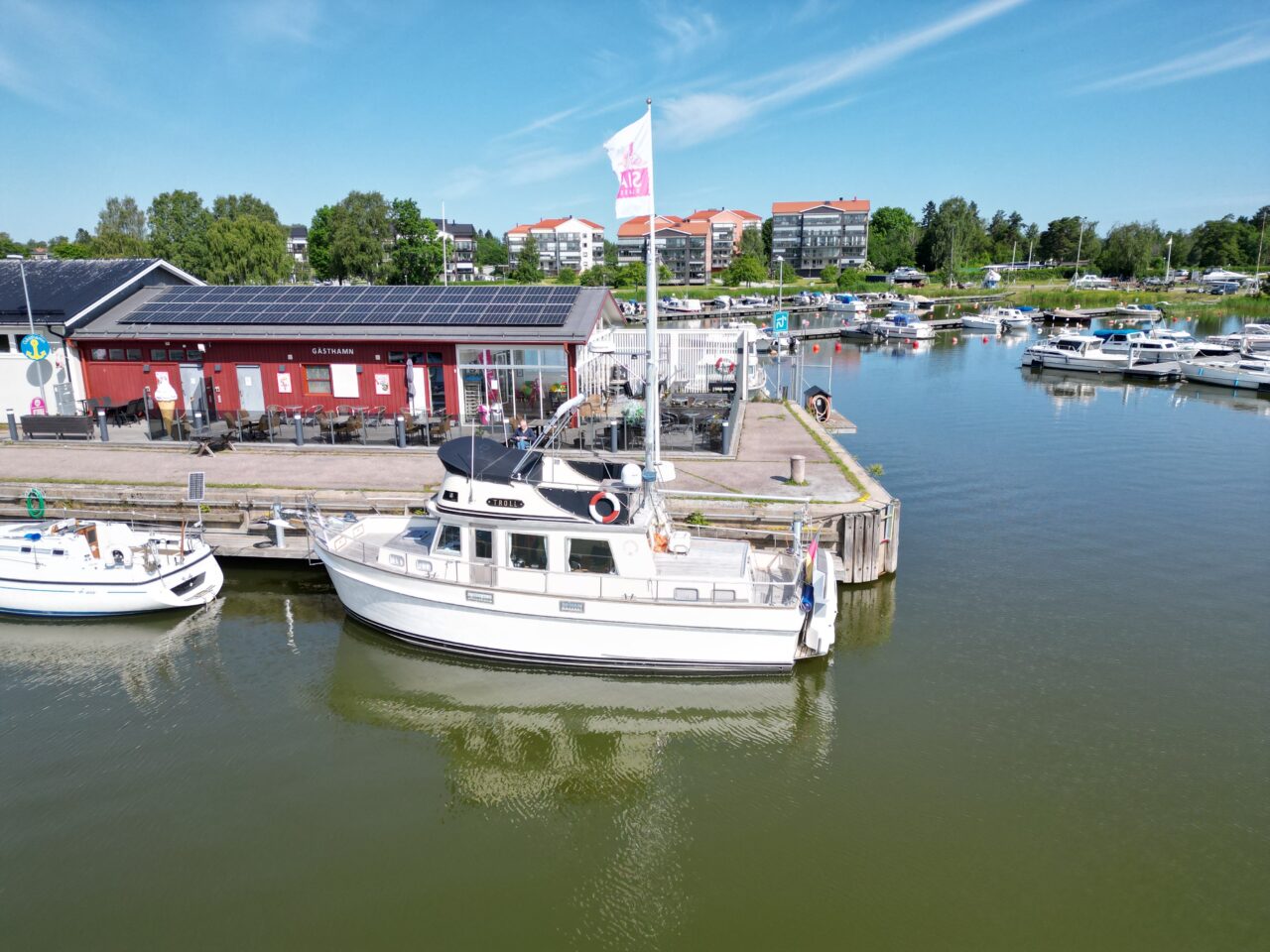 Am nächsten Morgen war alles vorbei und weiter gings. Trotz bestem Wetter kaum ein Segler oder Freizeitboot unterwegs, der Hafen von Öregrund fast leer, obwohl das Städtchen das St.Topez des Nordens genannt wird.Trotz ambitionierter Hilfe der Hafenmeisterin war das Anlegemanöver bei ziemlich viel Seitenwind und mit Mooringleine recht tricky mit unserem hohen Schiff.