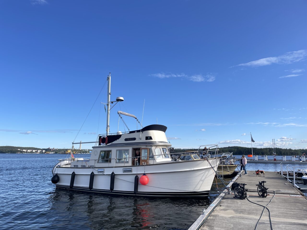 Nach 4 Tagen Ankern freuten wir uns auf mal wieder etwas Zivilisation. Bis nach dem Frühstück klarte es auf und wir nahmen Kurs auf Stockholm. Die Strecke nach Stockholm zu unserer Verwunderung gemütlich befahrbar. Keinerlei rasende Motorboote, Jetskifahrer oder Segelregatten wie auf unserer letzten Fahrt vor 2 Wochen aus der Stadt. Lediglich die schwellverursachenden Fähren kreuzten munter hin und her. Einfahrt zur Schleuse, die den Mälarensee vor dem Salzwasser der Ostsee schützt. Ein Hub von 0,4 m, es lohnte nicht festzumachen, Festhalten an den Seilen in der Schleusenmauer reichte aus. Der Mälarensee ist doppelt so groß wie der Bodensee und dient der Stadt Stockholm als Trinkwasserreservoir. Ehre wem Ehre gebührt ist ja klar und deshalb unser erstes Ziel ein Blick auf Schloss Drottningholm, in dem die Königsfamilie seit 1981 residiert. Prächtig, wahrlich majesthetisch liegt es da inmitten bewaldeteter Schären, sehr pittoresk. Zahlreiche Ankerbojen für Bootstouristen mit Sicht auf das Schloss, von denen erstaunlicherweise bis auf eine alle unbelegt waren. Nun gut, wir wollten ja auch nur kurz gucken und grüßen, drehten eine Runde und nahmen Kurs auf unseren ersten Binnenhafen: Jungfrusund. Der Gästehafen bis auf 3 Schiffe leer. Glück für uns, da das für uns das noch etwas gewöhnungsbedürftige Anlegemanöver an der Heckboje entspannter macht. Schön wars mal wieder an Land zu gehen, eine kleine Radrunde zum Einkaufen zu machen, zu duschen und den Abend mit einem Sundowner auf der Fly zu verbringen