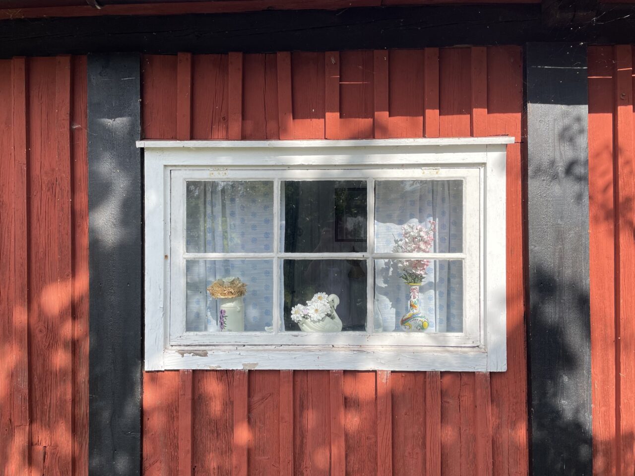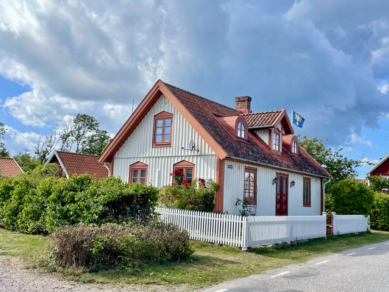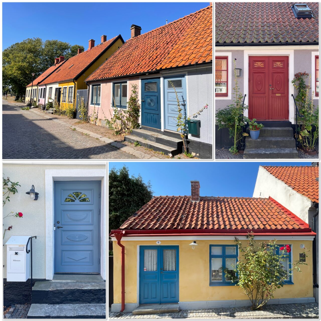 Übernachtungsstopp in dem uns nur allzu bekannten Hafen von Karlskrona (Hinfahrt 1 Woche abwettern) und am nächsten Morgen Pyjamastart um 6, günstige Schiffstankstelle noch genutzt und los ging die 58sm lange Fahrt über die Hanöbucht nach Simmrishamn. Insgesamt entspannte, sonnige Überfahrt, ein bequemer Längsliegeplatz im sehr schönen Hafen. Morgen soll es stürmisch werden, deshalb bleiben wir 2 Nächte. Auch Simmrishamn war uns in Erinnerung von unserem Törn 2022. Damals nur ein Übernachtungsstopp. Schön, dass es sich diesmal fügte, dass wir mehr Zeit hatten, das Städtchen näher kennenzulernen. Wirklich lohnenswert! Ein großer sehr aktiver Fischereihafen mit Røkeri und Restaurant, eine kleine Innenstadt sehr belebt und liebevoll gestaltet, viele kleine Geschäfte und die uralte Kirche. Eine virtuelle Stadtführung mit Karte und App führte uns in das überraschend große und liebevoll erhaltene historische Stadtviertel. Grobe Kopfsteinpflastergassen (sorry für die permanente Wiederholung) geduckte, einstöckige, bunte Häuschen mit kunstvoll geschnitzten Holztüren und überall (leider verblühte) Malven. Muss im Sommer ein Bilderbuchanblick sein. Wunder- wunderschön und wohl auch die letzten bunten Häuschen von denen ich in diesem Jahr berichten werde.